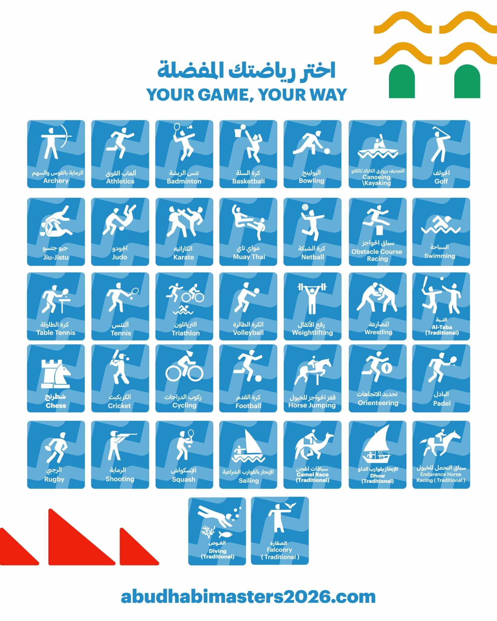 وأعلنت اللجنة المنظمة أن المشاركة في ألعاب الماسترز أبوظبي 2026 ، مفتوحة لجميع الأفراد ممن تبلغ أعمارهم 30 عاماً فما فوق، دون قيود على الخبرة أو المستوى الرياضي، وأنه على الراغبين في التسجيل الدخول على : https://abudhabimaste.