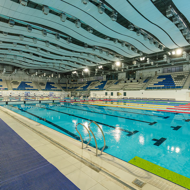 تُتيح هذه المنشأة الداخلية ذات الحجم الأوليمبي حارات يمكن التحكم في درجة حرارتها وأنظمة توقيت إلكترونية ومنصات عرض، ما يجعلها مكاناً مثالياً لمنافسات السباحة العالية الأداء.